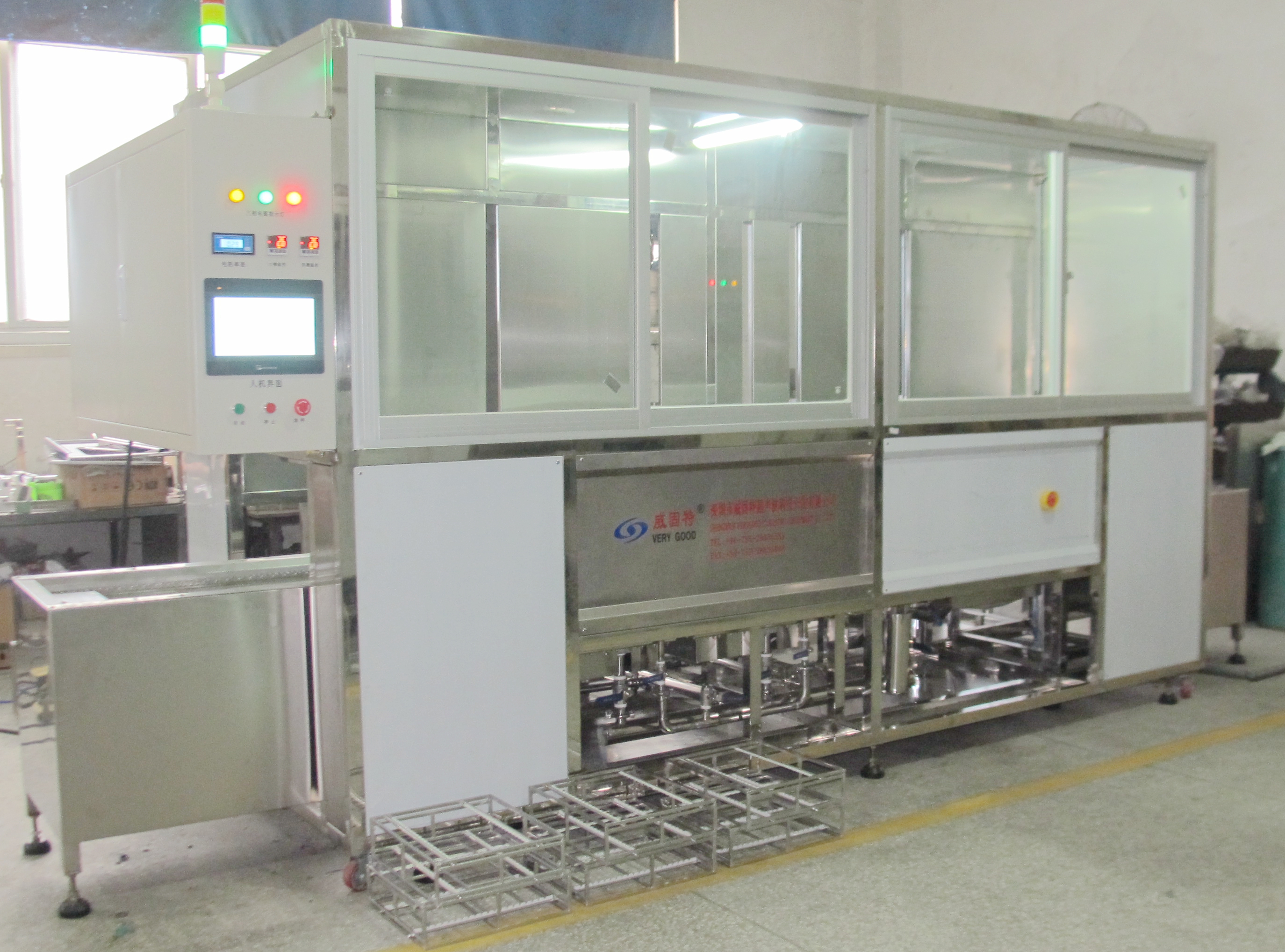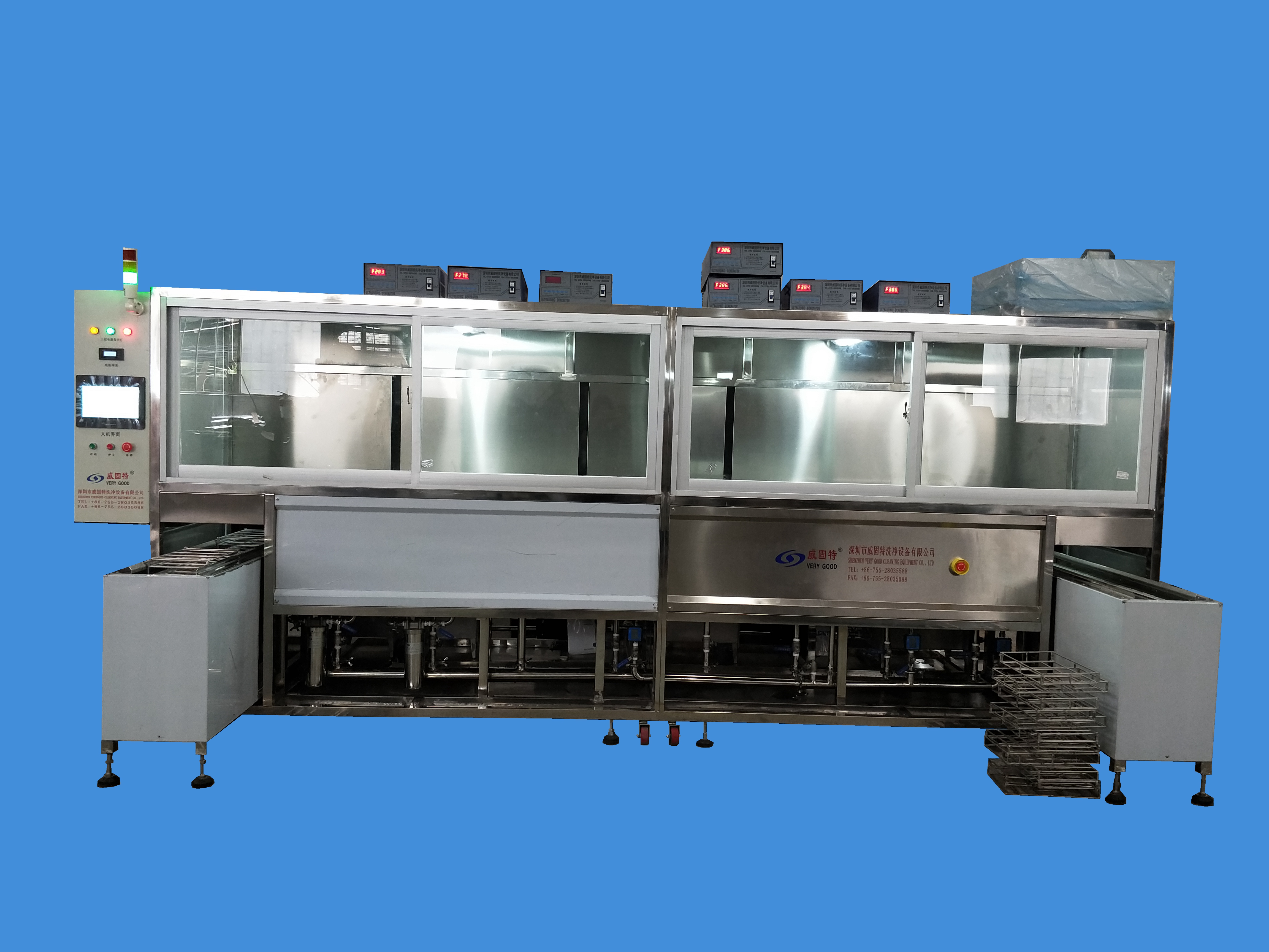 威固特全自動石英晶振監控片深圳超聲波清洗機設備共有8個功能槽,配置有循環過濾系統、自動恒溫系統、觸摸屏系統、拋動系統、超聲波清洗系統、預熱箱系統、溢流系統、噴淋系統等。
